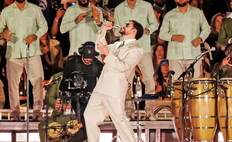 ¡Por si no los veo, Feliz Navidad y Feliz Año Nuevo México!”, gritó Bad Bunny antes de que comenzara Turista, que tocó en una suerte de paso doble, de danzón, trajeado en blanco, elegante a la usanza de Nueva York en los sesenta y setenta, con saco cruzado, lentes de gota grandes y oscuros, sacando sus mejores pasos al ritmo del tumbao.