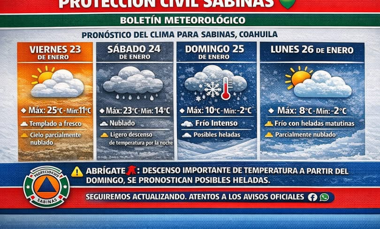 Protección Civil Sabinas informa a la ciudadanía que, de acuerdo con el análisis de modelos meteorológicos utilizados por la NOAA (National Oceanic and Atmospheric Administration) y plataformas que integran dichos datos, se prevén cambios importantes en las condiciones del clima para los próximos días, principalmente por la influencia de un sistema frontal que afectará al norte del país.
