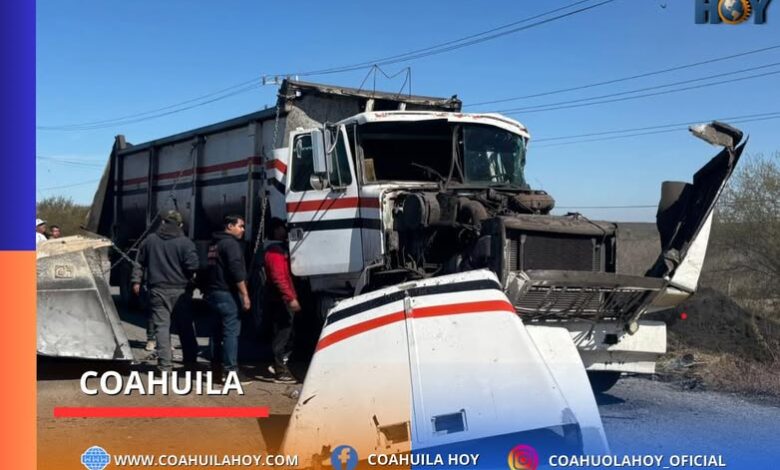 VILLA DE BARROTERÁN, COAHUILA.– La mañana de este martes se registró un accidente vehicular en el tramo Estación Barroterán – Minas de Barroterán, donde un tráiler carbonero terminó volcado a un costado de la vía.