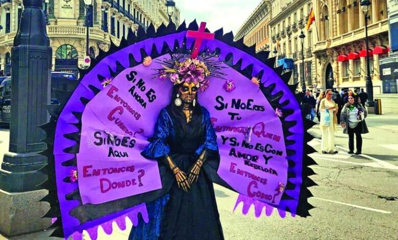 Las mexicanas en la capital de España han resignificado a las catrinas. Las mariposas monarcas migrantes, mejor conocidas como las 3M, una agrupación feminista “mexa” que marcha en la manifestación del 8M, usa a la catrina como su símbolo representativo. Más allá de significar la muerte, como regularmente ocurre, para ellas, como extranjeras, es sinónimo de seguridad y de sus raíces.