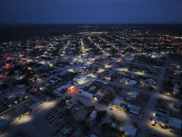 #Múzquiz, Coahuila.– El Gobierno Municipal de Múzquiz, que preside la alcaldesa Laura Jiménez Gutiérrez, a través de la Dirección de Imagen Urbana, continúa avanzando en la modernización del alumbrado público en Minas de Barroterán, alcanzando un 80 por ciento en la instalación de luminarias LED.