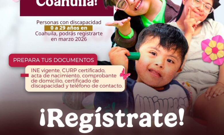 Piedras Negras, Coahuila.- La delegación del Bienestar Federal estará realizando el registro para el programa de personas con discapacidad, lo cual se llevará a cabo del 22 al 29 de marzo, y en lo referente a Piedras Negras, se cita a los interesados a presentarse en las instalaciones del CAI, que es donde estarán las mesas de trabajo.