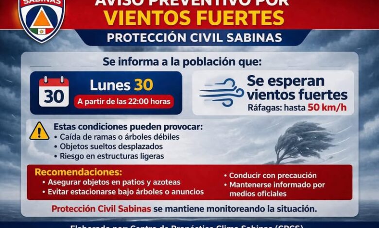 AVISO PREVENTIVO POR VIENTOS FUERTES PROTECCIÓN CIVIL SABINAS