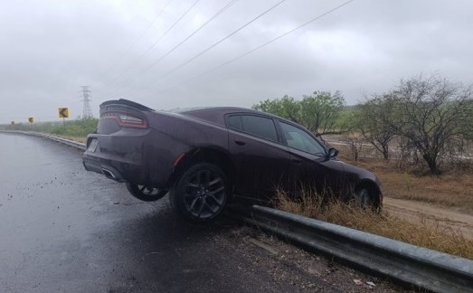 Una pareja de nigropetenses terminó con su automóvil atascado en la guarda de una curva y pendiendo del talud, luego de sufrir un accidente sobre la carretera federal 57, a la altura del kilómetro 23 en el Puente de la Cebada en el municipio de Nava.