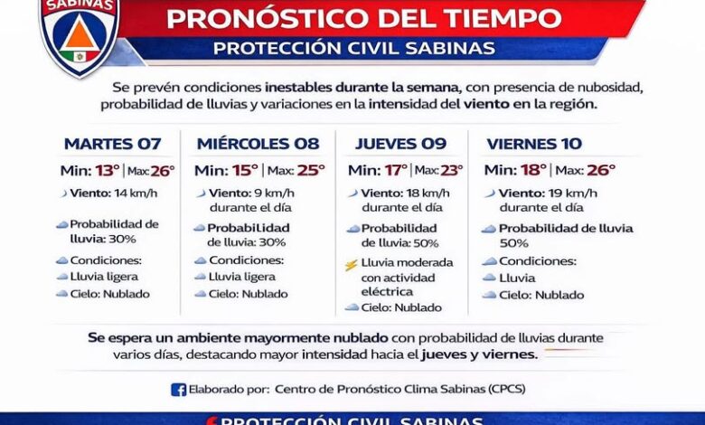 Se prevén condiciones inestables durante la semana, con presencia de nubosidad, probabilidad de lluvias y variaciones en la intensidad del viento en la región.