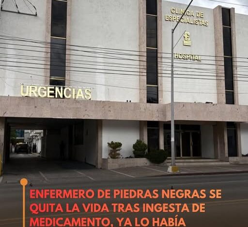 Un enfermero de una clínica particular ubicada en la avenida Carranza acabó con su vida luego de ingesta de medicamento en Piedras Negras.