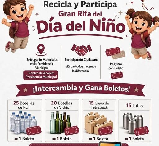 El Gobierno Municipal de Allende, en coordinación con INAMESA, invita a la ciudadanía a participar en la Gran Rifa del Día del Niño “Recicla y Participa”, una actividad que promueve el cuidado del medio ambiente y la participación de las niñas y niños.
