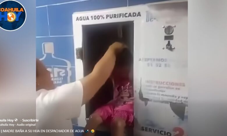 A través de redes sociales se volvió viral un que ha generado indignación y debate en Torreón, al mostrar a una madre bañando a su hija en un despachador de agua en la colonia Valle Oriente de Torreón