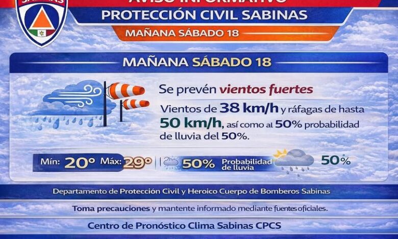 Se informa a la ciudadanía que para el día de mañana sábado 18, se prevén vientos fuertes, con velocidades aproximadas de 38 km/h y ráfagas de hasta 50 km/h, así como una probabilidad de lluvia del 50%. Se espera una temperatura mínima de 20°C y una máxima de 29°C. Estas condiciones pueden generar el desplazamiento de objetos ligeros y cambios en el estado del tiempo, por lo que se recomienda a la población tomar precauciones.…