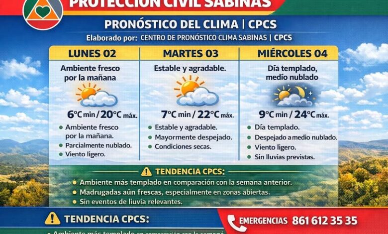 Elaboración: Centro de Pronóstico Clima Sabinas (CPCS) Lunes 02 de febrero Se espera un día con ambiente fresco por la mañana y templado por la tarde. Temperaturas estimadas: mín. 6°C, máx. 20°C Cielo parcialmente nublado. Viento ligero a moderado. Sin probabilidad significativa de lluvia. Martes 03 de febrero Continuará el clima estable y agradable, con mañanas frescas. Temperaturas estimadas: mín. 7°C, máx. 22°C Cielo mayormente despejado. Viento moderado en algunas horas del día. Condiciones secas.…